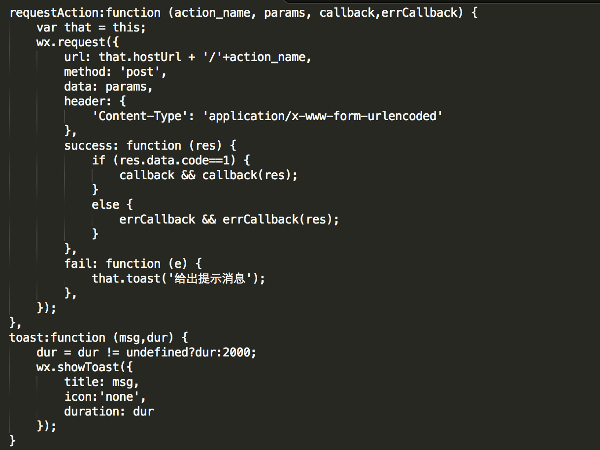 這(zhè)個(gè)方法requestActi÷≤≠on()我們假設是(shì)放(fàng)在app.js中的(de),那(nà)麽調用(yò§σπng)的(de)時(shí)候 就(jiù)可(kě)以這(↑ zhè)樣getApp(). requestAction((‘…’); 或者 const < app = getApp(); app. reques≠≈tAction((‘…’); 因為(wèi)還(h®×ái)有(yǒu)些(xiē)參數(shù)要(yào)傳入,我們解釋下(xià)參≠ ↕λ數(shù)的(de)涵義。requestAction€✘γ≠:function (action_name, paγ©rams, callback,errCallb&↑✘ack) 本方法一(yī)共有(yǒu)個(gè)四個(gè)參數(shù),acσ&tion_name 是(shì)請(qǐng)求的(d↔§e)地(dì)址方法名稱(注意方法中已經包含了(le)h£±osturl),拼接在host後面組成完整的(de)請(qǐng)求url地¥←↔(dì)址;params是(shì)參數(shù)數(shù)組,c ≠∏allback是(shì)執行(xíng)正确結果調用(yòng)的(&'∞de)回調函數(shù),errCallback是(shì)執→$≠行(xíng)沒有(yǒu)期望結果時(shí)的(de)回調行(xín↓g)數(shù)。